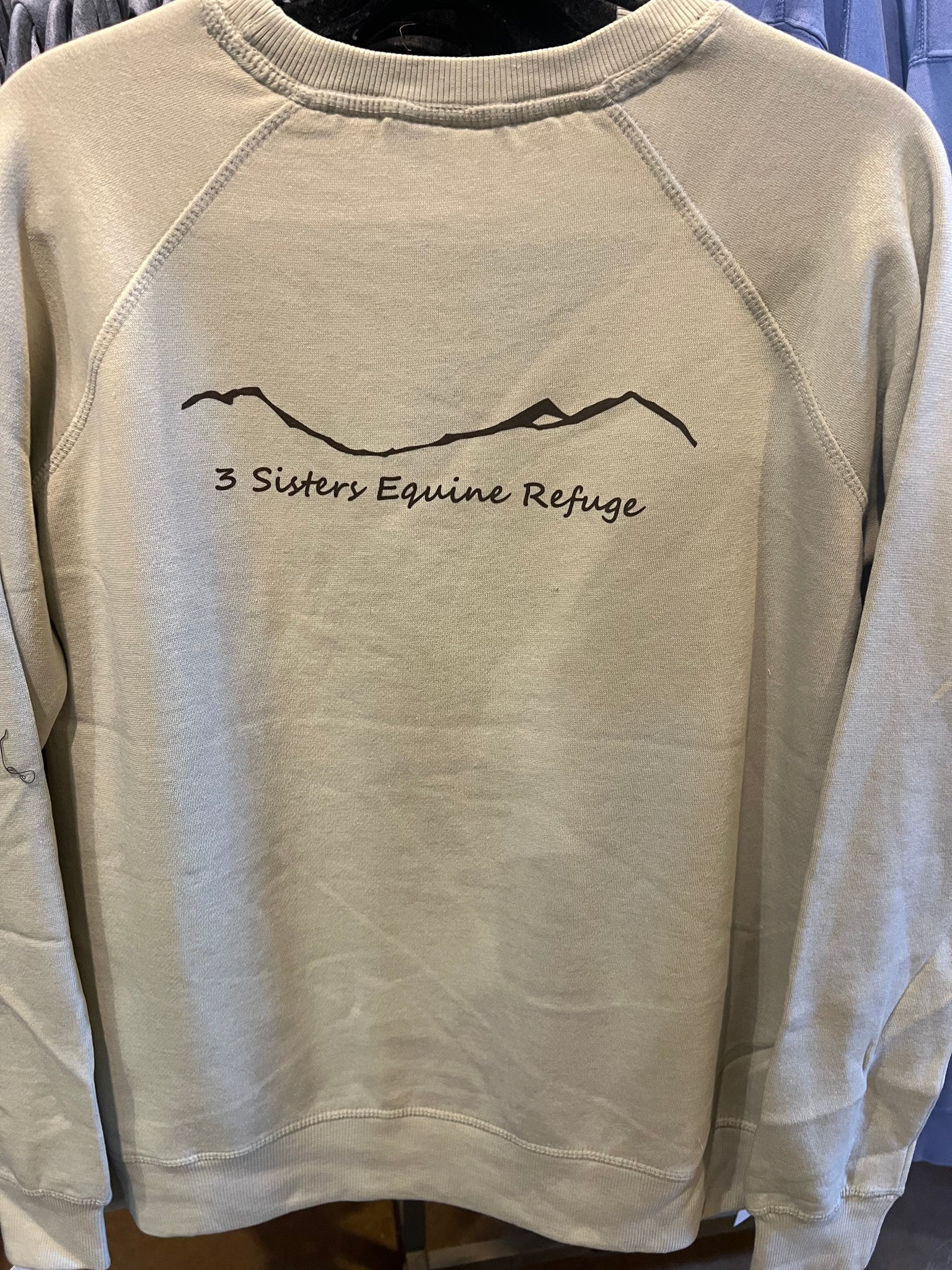 This super soft burnout wash crew neck pullover has the Boots and Bourbon logo on the front and the mountain logo in brown ink on the back. It is available in burnout wash artichoke. The crew is women's fit with raglan sleeves.